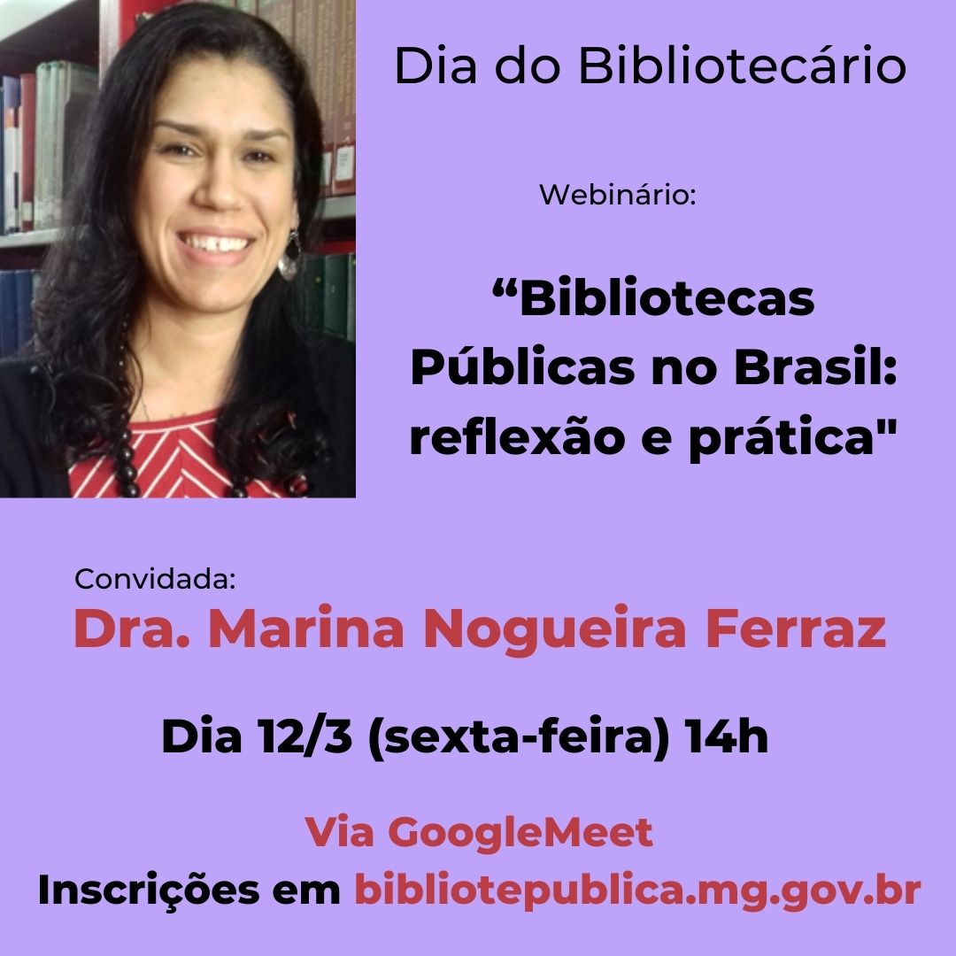 Em comemoração ao Dia do Bibliotecário, a Biblioteca Pública Estadual de Minas Gerais realiza o webinário "Bibliotecas Públicas no Brasil: reflexão e prática". O evento, que acontece de forma virtual na sexta-feira (12/3), a partir das 14h, vai contar com a participação de Mariana Nogueira Ferraz, bibliotecária da Biblioteca J. Baeta Vianna, da Faculdade de Medicina da UFMG, e Professora conteudista do Curso de Biblioteconomia do Centro Universitário Claretiano.As inscrições para a atividade são gratuitas e podem ser feitas neste link. O convite para acesso à sala será enviado aos inscritos até as 12h de quinta-feira (11/3). A abertura do ambiente virtual para o Webinário ocorrerá às 13h30 da sexta-feira (12/3). Ao fim do encontro, os participantes receberão, no e-mail informado na inscrição prévia, um certificado de participação que corresponde a duas horas.