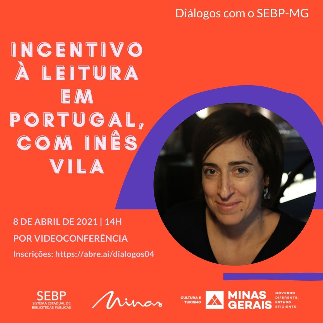 A edição de abril do projeto Diálogos com o SEBPMG amplia as fronteiras do incentivo à leitura e recebe a bibliotecária portuguesa Inês Vila. Iniciativa do Sistema Estadual de Bibliotecas Públicas Municipais de Minas Gerais (SEBPMG), o encontro virtual será realizado na quinta-feira (8/4), a partir das 14h.Durante a palestra, a convidada vai contar um pouco mais sobre sua experiência com o trabalho realizado na Câmara Municipal do Porto (Portugal), onde chefia a Divisão Municipal de Bibliotecas e coordena diversas atividades de incentivo à leitura.